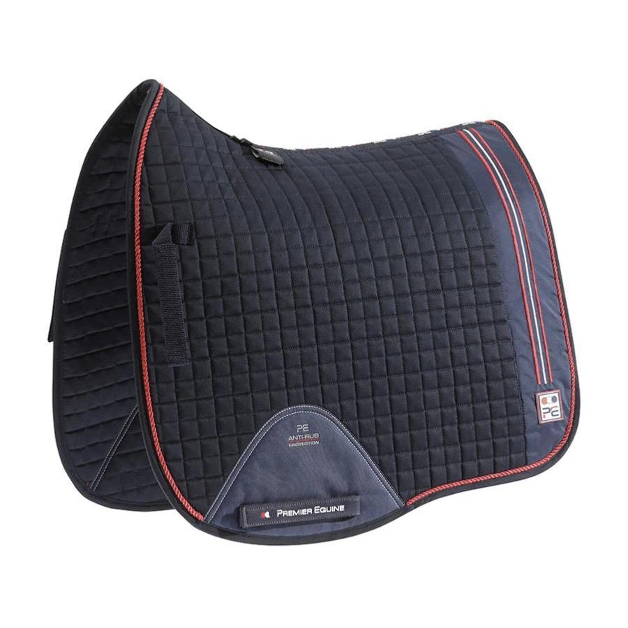 Our Sports European Cotton Dressage Square boasts a luxury, professional appearance. Made from beautifully quilted cotton, it is breathable and helps to draw moisture. A European style cutaway hem and decorative twisted ropes combined with stylish, ‘PE’ branded strip panels to the rear create a crisp, sporting aesthetic. Adjustable Velcro straps easily secure the pad under saddle and our signature 600D anti-rub protection zones help to prevent friction and rubbing from the girth. A stunning saddle pad, perfect for everyday or competition use under dressage saddles.