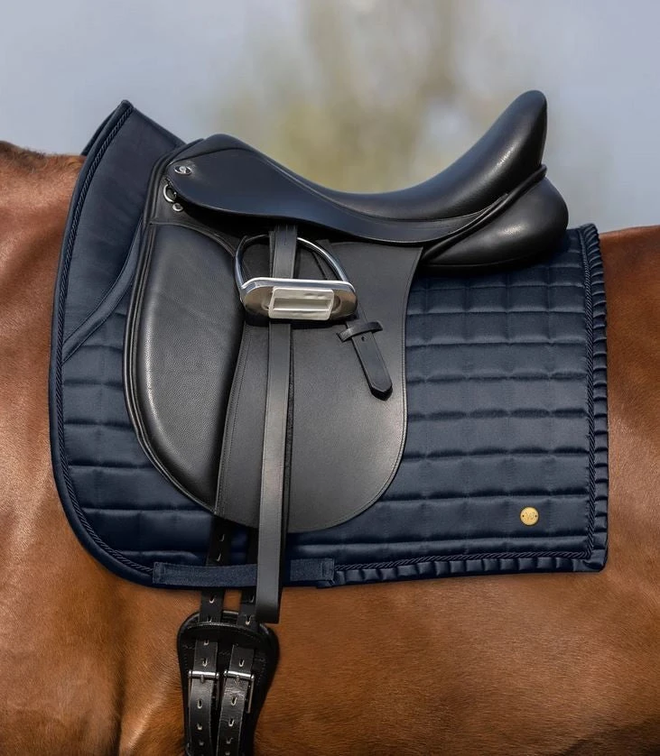 Elegant saddle pad with a gathered edge and a silky appearance. With the aid of the stop cushion and the straightforward or subdivided girth strap loop, saddle slippage is avoided. Comfort is enhanced by the bamboo lining’s ability to absorb sweat.